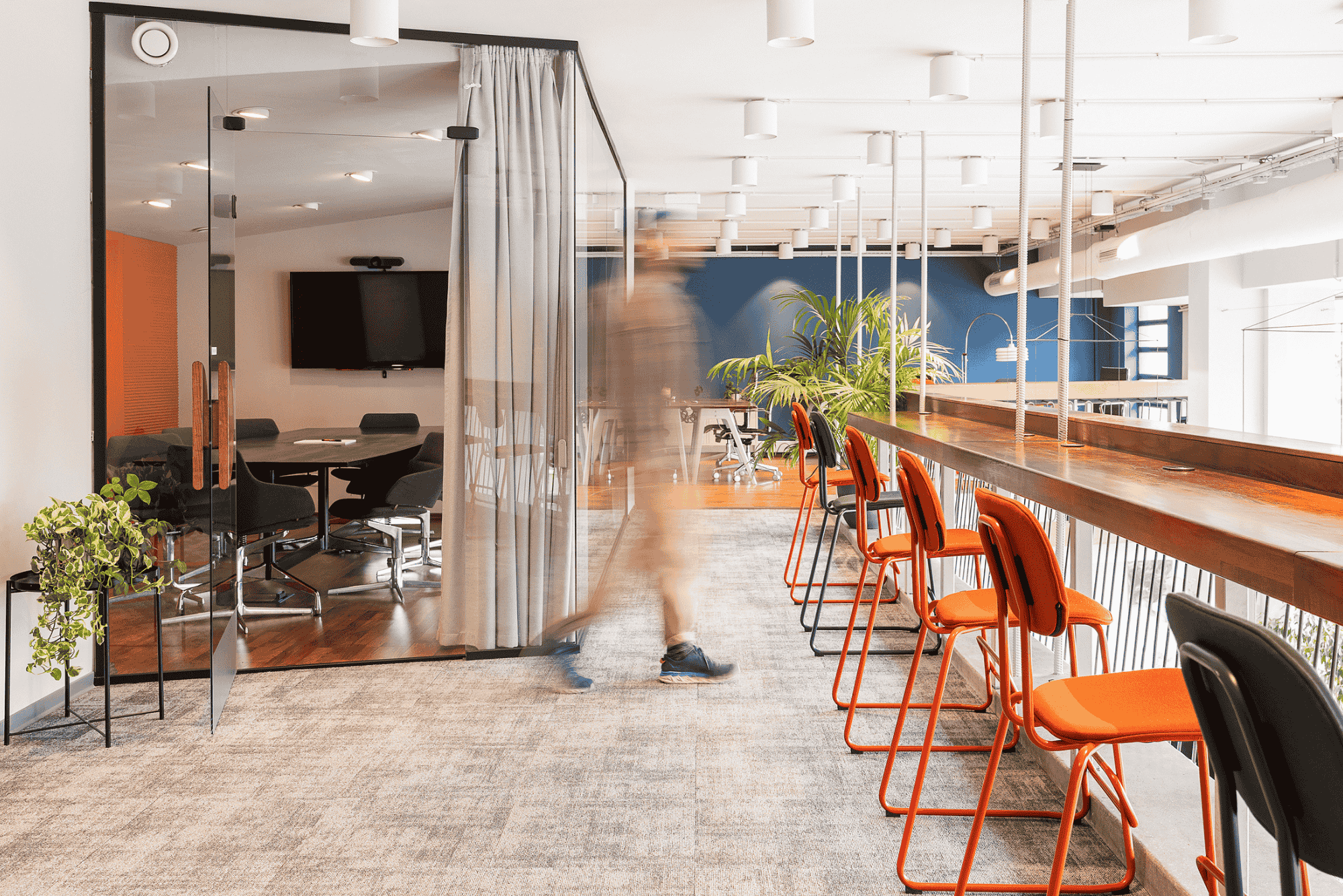 Az emeleten klasszikus közösségi munkaállomásokat alakítottunk ki. A hangcsillapító függönyök és a lépéselnyelő szőnyeg segítségével támogatjuk, hogy gyorsan fókuszált állapotba tudj kerülni.